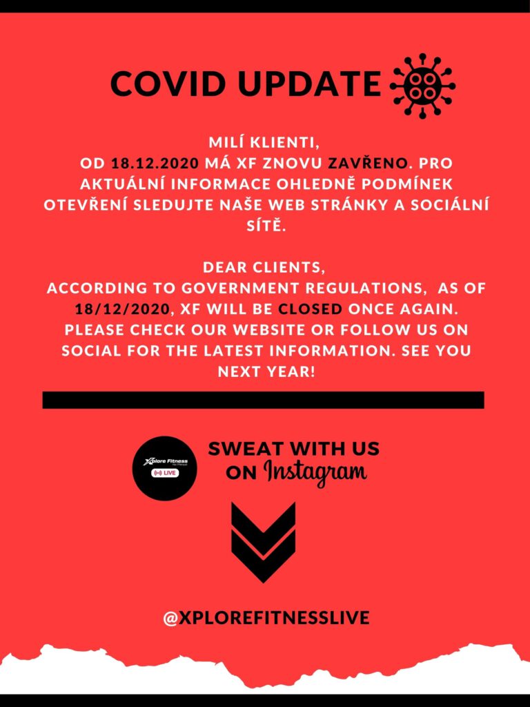 Opět nám vláda naše milované XF zavřela. Dle vládního nařízení jsme nuceni zavřít počínaje dnem 18.12.2020. Bohužel na dotazy, kdy opět otevřeme, nejsme schopni odpovědět. Neznáme odpovědi i na spoustu jiných otázek, a tak nezbývá, než se ptát stále dokola a bojovat. Pevně doufáme, že se přehoupnutím přes Nový rok zbavíme štěkacích „PSŮ & KOČEK“ a opět se potkáme při cvičení /v rámci zdravého životního/ stylu zde, v XF.