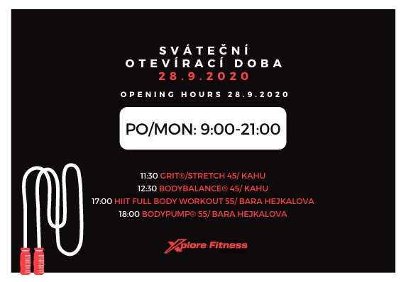 Vážení klienti, ve sváteční den dne 28. září máme otevřeno jako o víkendu, tzn. od 9-21 hodin. V poledne i večer jsme pro vás připravili vždy 2 lekce, abyste celý den nezaháleli a zasloužený oběd či večeře přeci chutnají nejlépe 🙂 ).