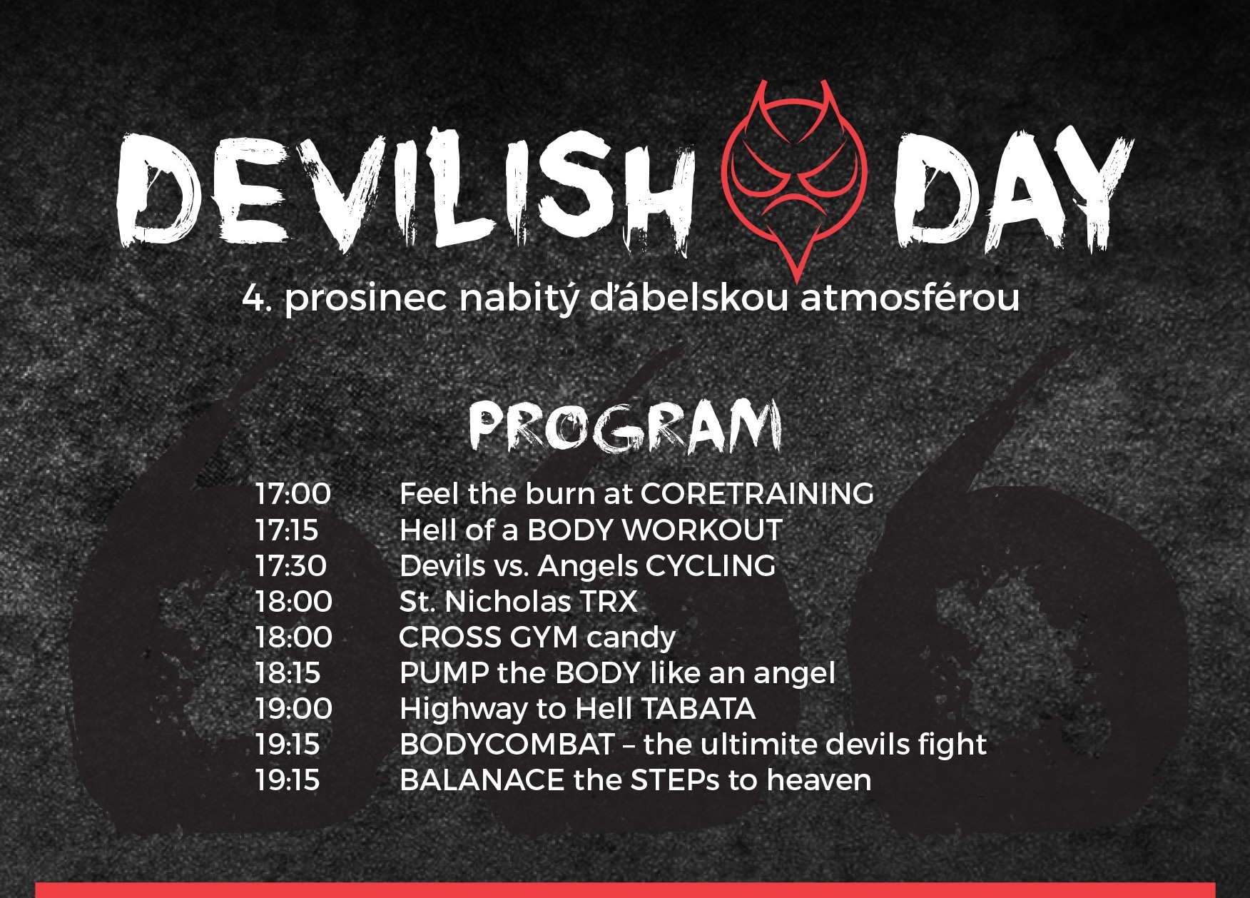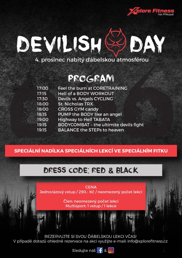 Pokud máte dost odvahy a chcete s námi prožít speciální den plný speciálních lekcí v našem speciálním fitku, udělejte si poznámku v kalendáři 4.12. od 17:00 do 20:00 hodin v tomto znění: „XF ďábelské odpoledne“.